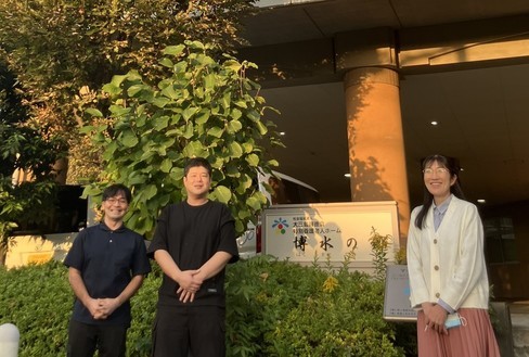 〈施設前での1枚〉左から岩永さん、佐藤さん、長島さん