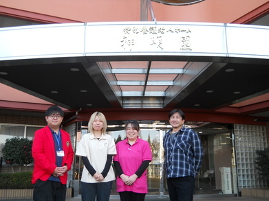 ≪施設前で≫右から園長 中村正人さん、澤田さん、高篠さん、生田目さん