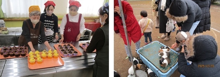 毎月第四木曜日に「喫茶やすらぎ」を開催。10月はハロウィンのカップケーキを用意したり、生演奏で盛り上がったり。喫茶の運営にあたるコーヒーの準備・洗い場・ウェイトレスなどは白寿荘の利用者、地域のボランティアの方が主に担ってくださり、交流の機会にもなっています。また、喫茶以外にもイベントとして移動動物園を開催し、地域からもたくさんの参加がありました。